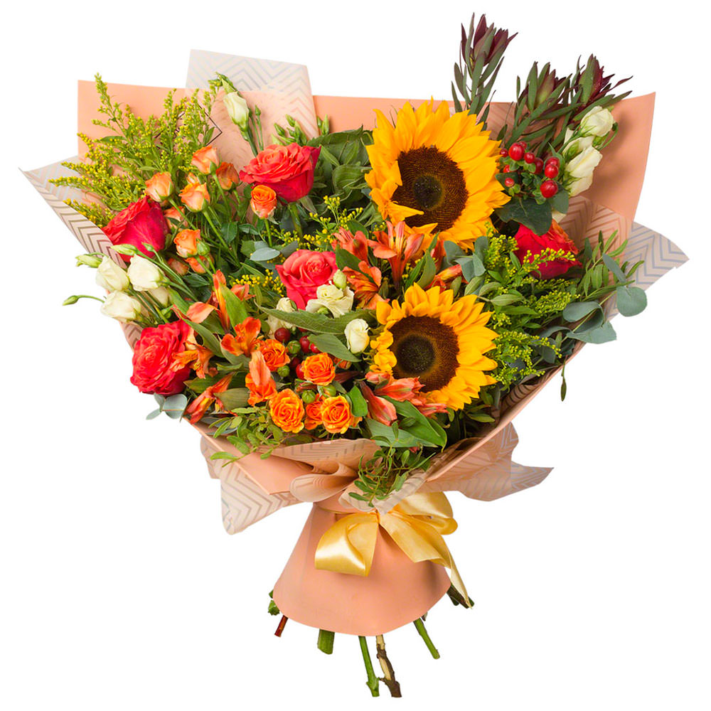 Подсолнух, кустовая роза, эустома, альстромерия, экзотическая зелень.